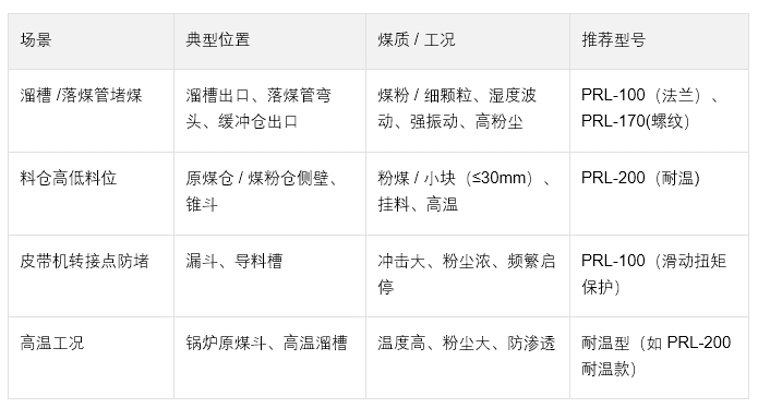 • 常规溜槽 / 落煤管:PRL-100(法兰)或 PRL-170(螺纹),IP65,适配大多数场景。